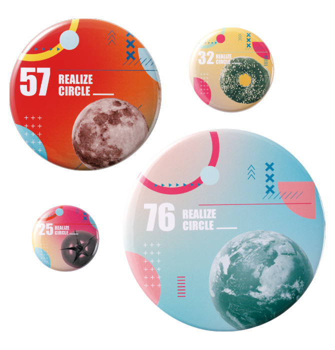 イラストや写真、ロゴなど、どんなデザインとも相性の良いベーシックな缶バッジです。25mmから150mmまで幅広いサイズ展開があり、用途やデザインに合わせて最適なサイズを選べます。定番アイテムだからこそ、グッズ制作が初めての方にも取り入れやすく、安定した人気を誇ります。