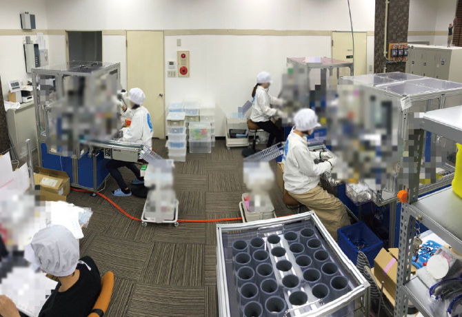 国内3カ所の自社工場で、独自開発の製造機による自動生産を行っています。人の手に触れずに仕上がり、機械での製造なので絵柄とピンのズレがなく、ホコリの混入も徹底排除。手動プレス機の約7倍、半自動プレス機の約4.8倍のスピードで、品質と大量生産の両立を実現しています。